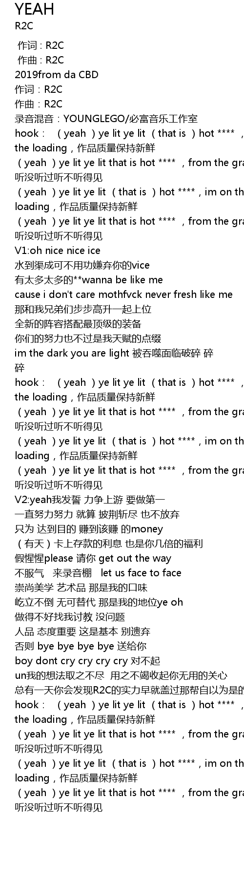 | [01:48.945] | 总有一天你会发现R2C的实力早就盖过那帮自以为是的说唱明星 |