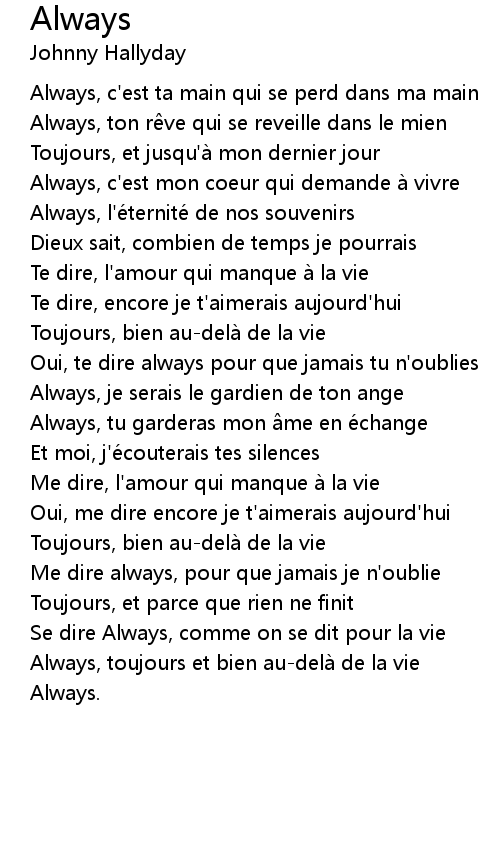 | Oui, te dire always pour que jamais tu n'oublies | |