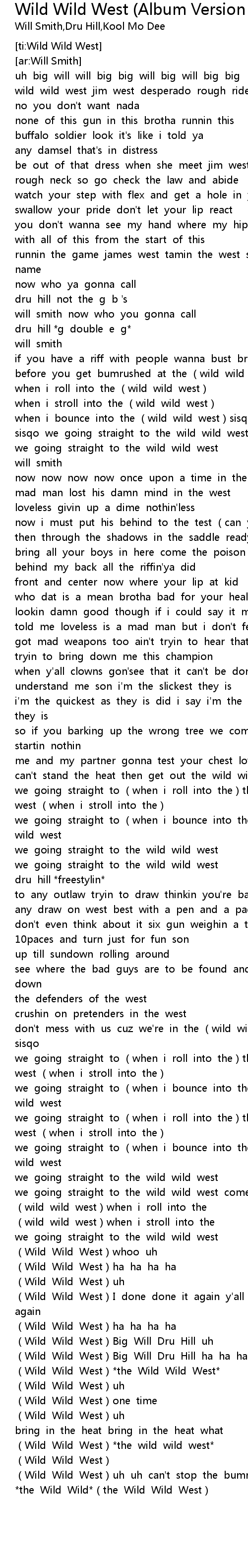 | [03:31.68] | Wild Wild West Big Will Dru Hill ha ha ha ha |