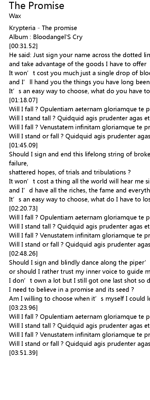| [01:18.57] | Will I fall ? Opulentiam aeternam gloriamque te promitto |