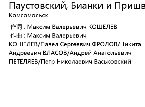 | [00:00.00-1] | 作曲 : Максим Валерьевич КОШЕЛЕВ/Павел Сергеевич ФРОЛОВ/Никита Андреевич ВЛАСОВ/Андрей Анатольевич ПЕТЕЛЯЕВ/Петр Николаевич Васьковский |
