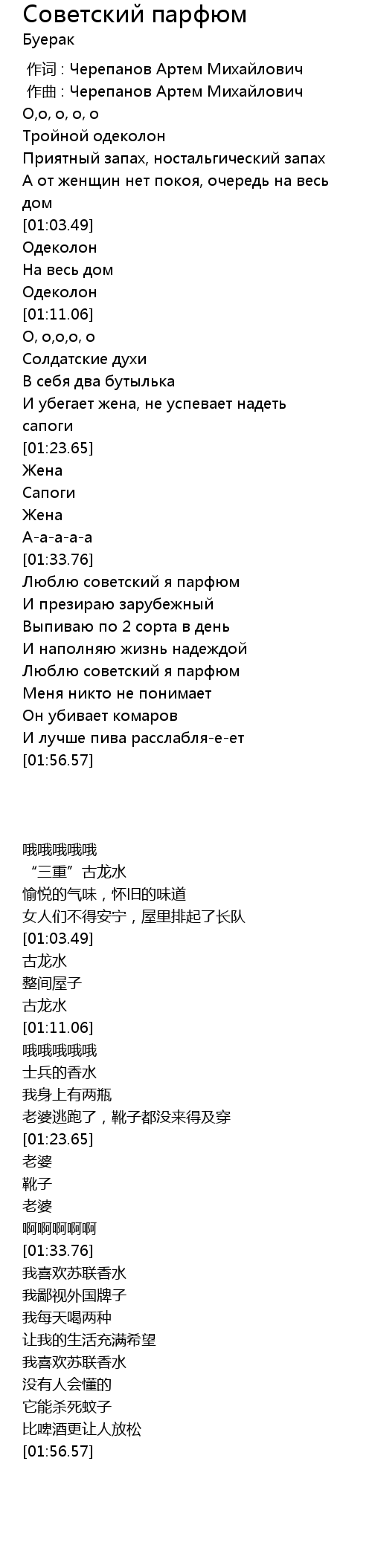 | [01:35.54] | Люблю советский я парфюм |