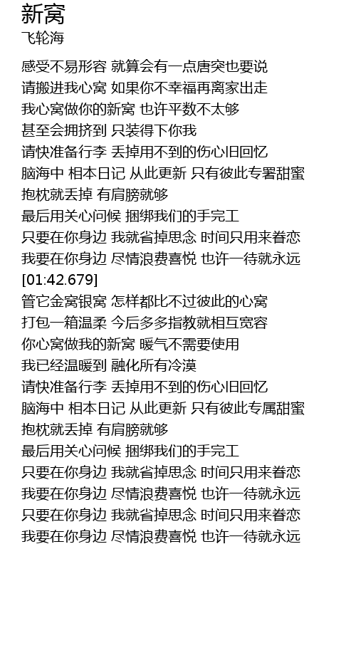 | [01:53.449] | 管它金窝银窝 怎样都比不过彼此的心窝 |