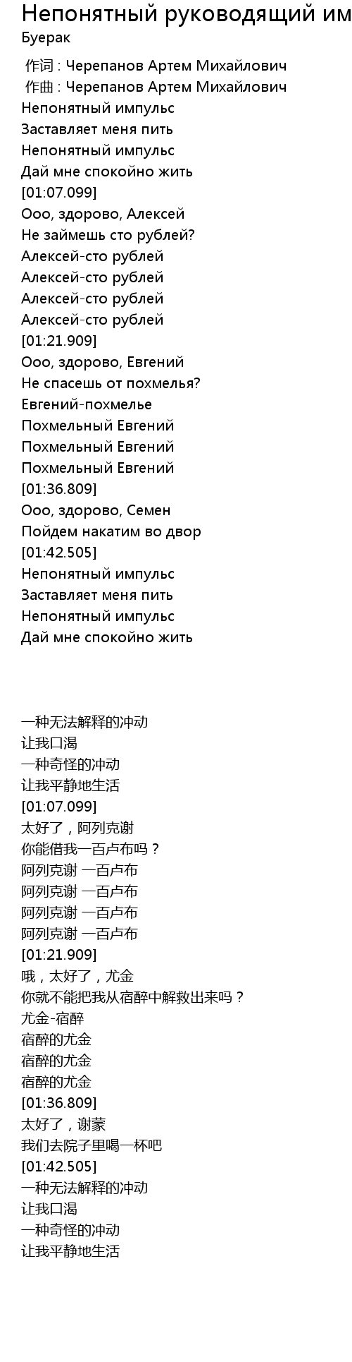 | [01:19.416] | 阿列克谢 一百卢布 |