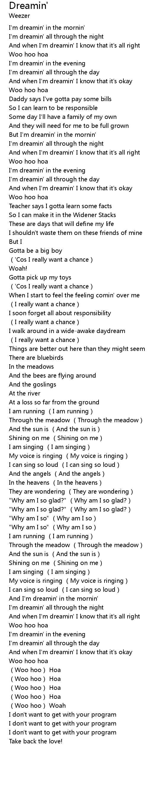 | [04:19.500] | And when I' m dreamin' I know that it' s all right |