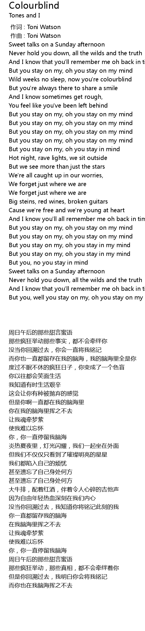| [01:16.29] | But you stay on my, oh you stay on my mind |