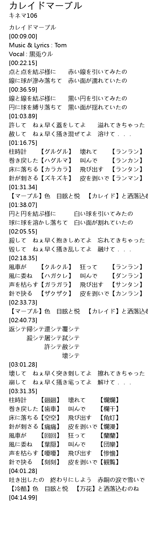 | [00:29.50] | 線に球が滲み落ちて 赤い面が濡れていたの |