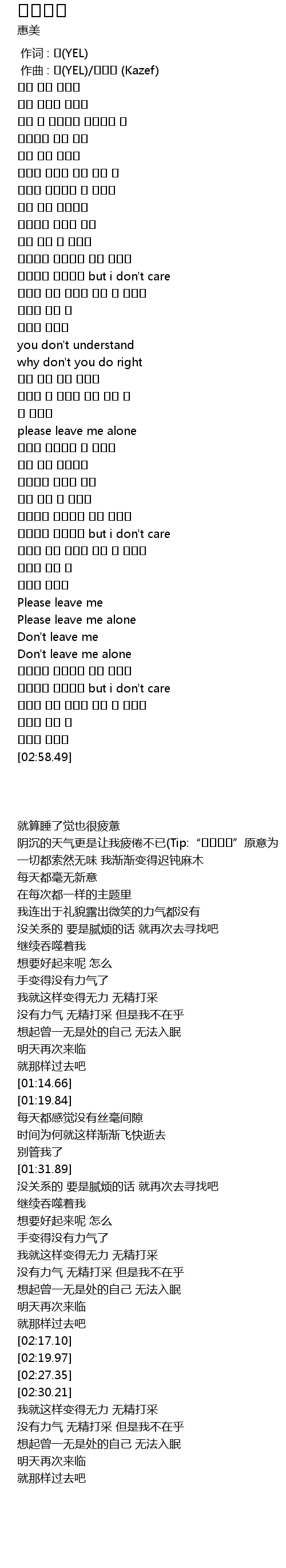 | [02:43.29] | 没有力气 无精打采 但是我不在乎 |