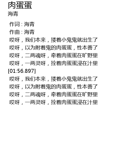 | [01:21.491] | 哎呀,二两魂呀,牵着肉蛋蛋在旷野里 |