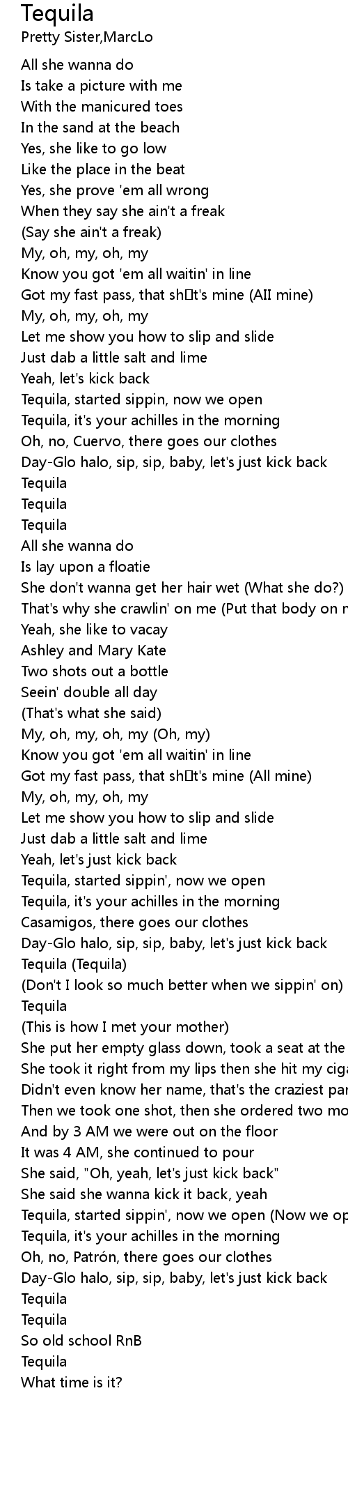 | [00:48.268] | Tequila, started sippin, now we open |