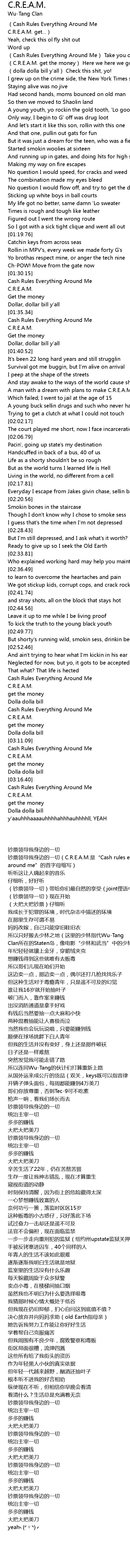 | [00:08.35] | 钞票领导我身边的一切(C.R.E.A.M.是“Cash rules everything around me”的首字母缩写) |
