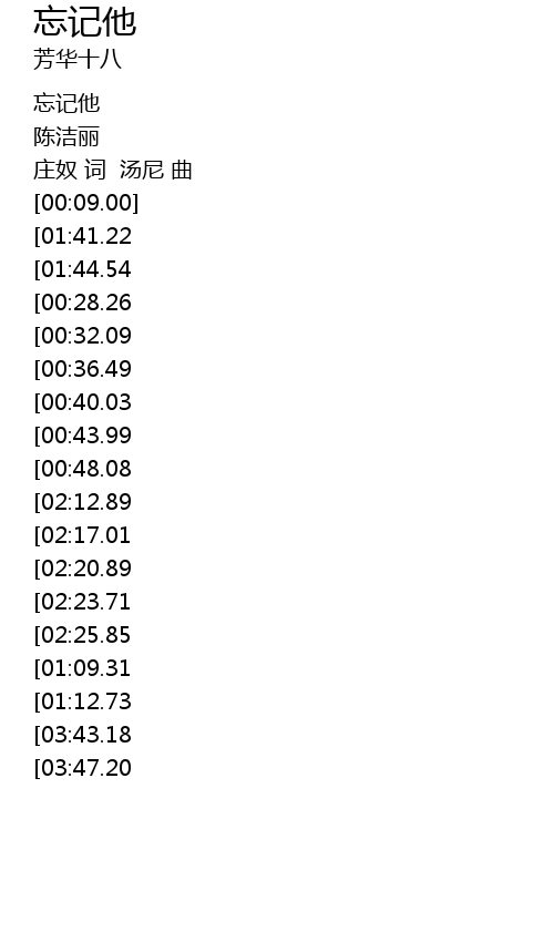 | [03:35.40][01:41.22][00:20.32] | 忘记他 |