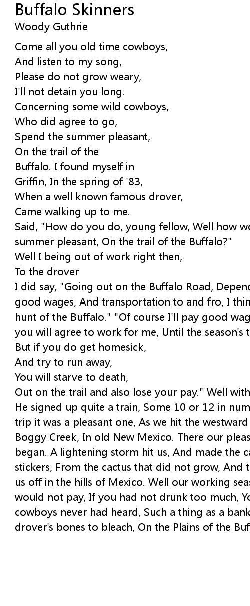 I did say, "Going out on the Buffalo Road, Depends on the pay. If you will pay good wages, And transportation to and fro, I think I might go with you, On the hunt of the Buffalo." "Of course I'll pay good wages, And transportation too, If you will agree to work for me, Until the season's through." |