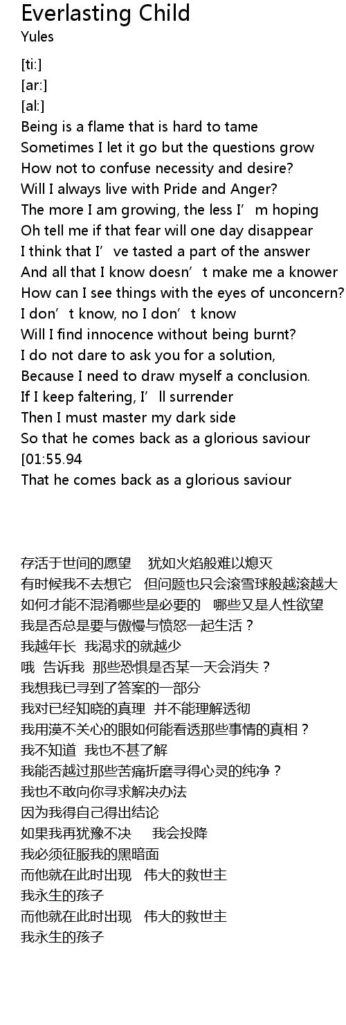 | [02:05.63][01:55.94] | My own everlasting child |