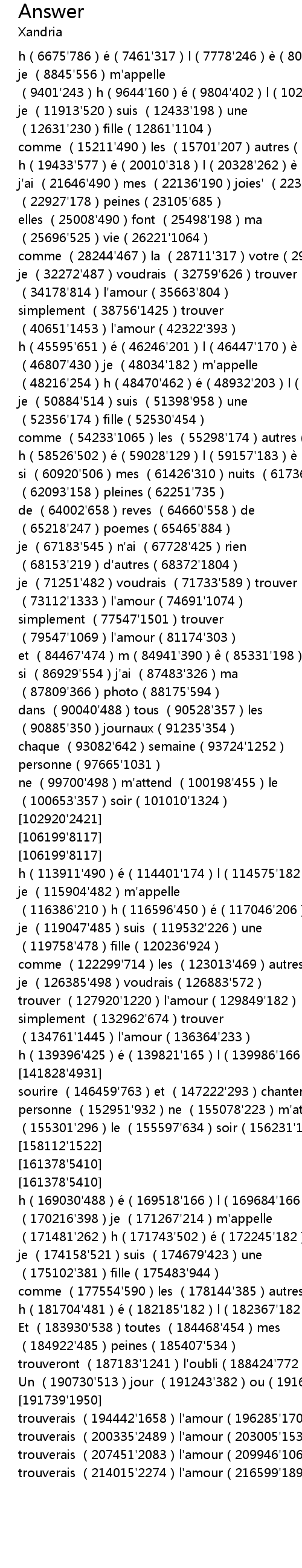 | [169030'4279] | h 169030' 488e 169518' 166 l 169684' 166e 169850' 366 ne' 170216' 398 je 171267' 214 m' appelle 171481' 262 h 171743' 502e 172245' 182 l 172427' 198e 172625' 254 ne 172879' 422 |