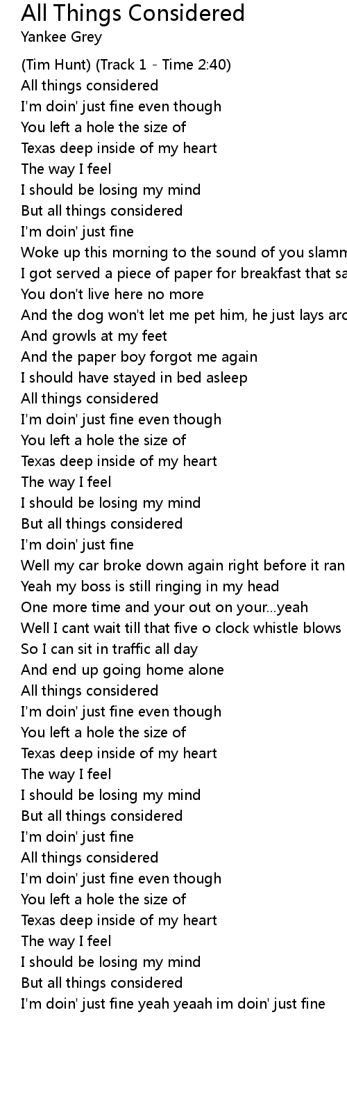 I'm doin' just fine yeah yeaah im doin' just fine |