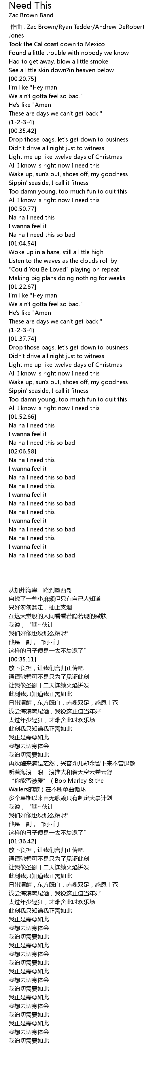 | [00:00.00] | zuo qu : Zac Brown Ryan Tedder Andrew DeRoberts Jason Boyd Caroline Jones |