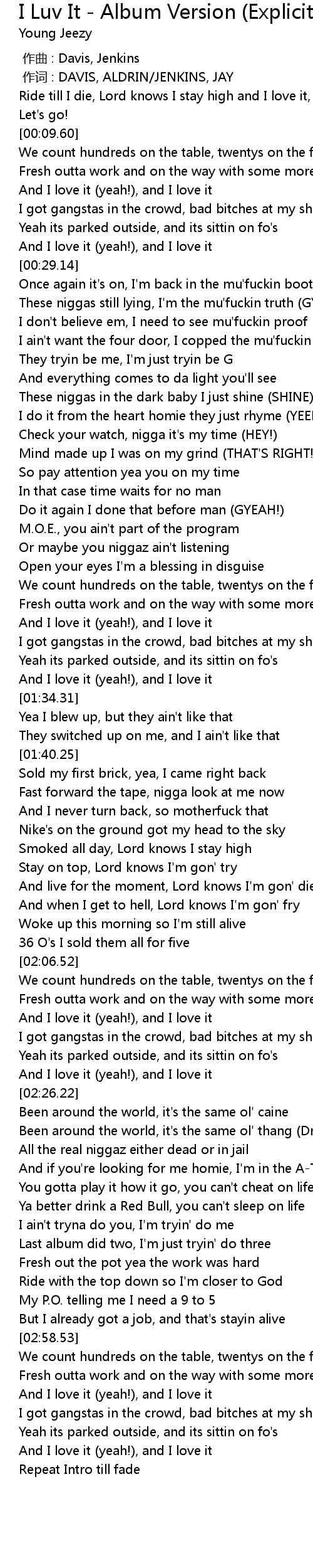 | [00:01.22] | Ride till I die, Lord knows I stay high and I love it, and I love it |
