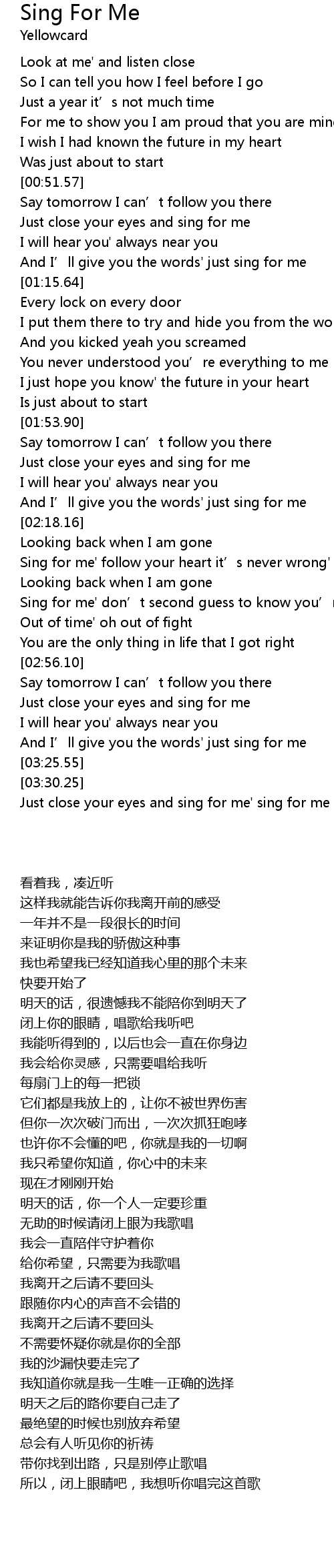 | [02:23.91] | Sing for me' follow your heart it' s never wrong' sing for me |