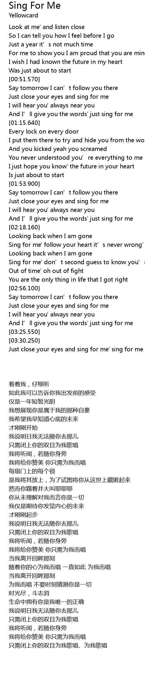 | [02:23.910] | Sing for me' follow your heart it' s never wrong' sing for me |