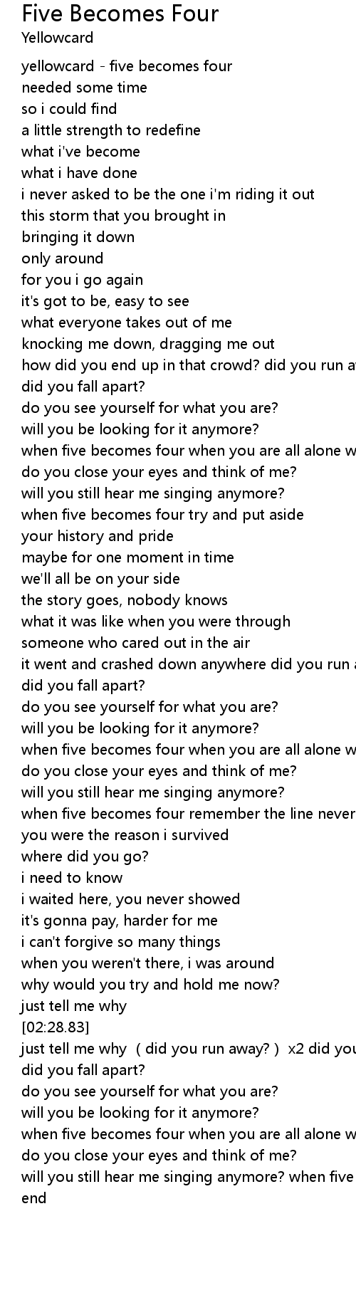 | [03:01.90] | will you still hear me singing anymore? when five becomes four… |