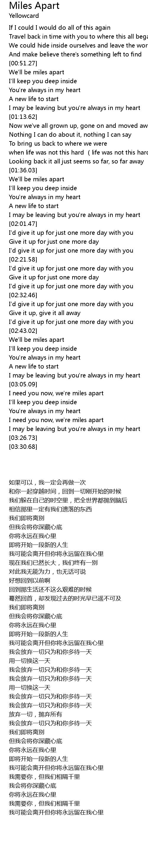 | [03:16.40] | I need you now, we' re miles apart |