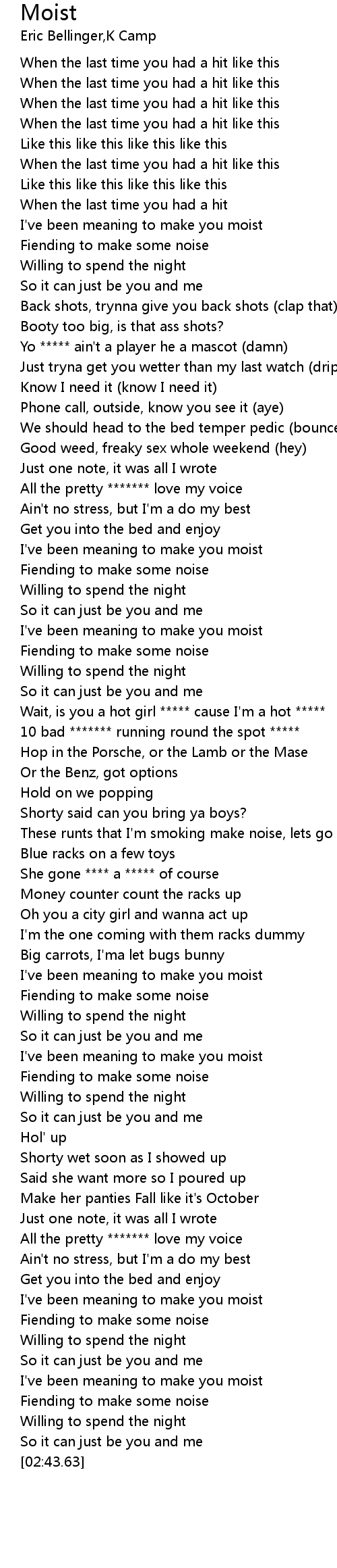 | [02:33.35] | I've been meaning to make you moist |