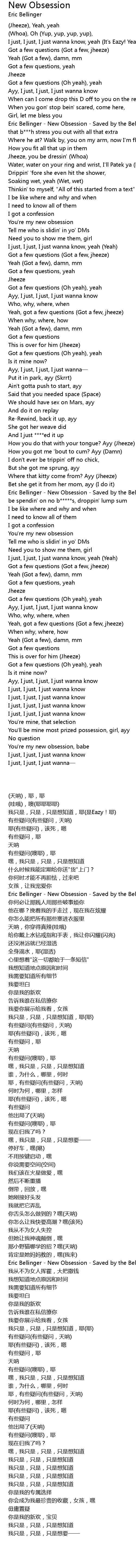 | [00:32.68] | Eric Bellinger - New Obsession - Saved by the Bellinger - Why you let that b***h stress you out with all that extra |