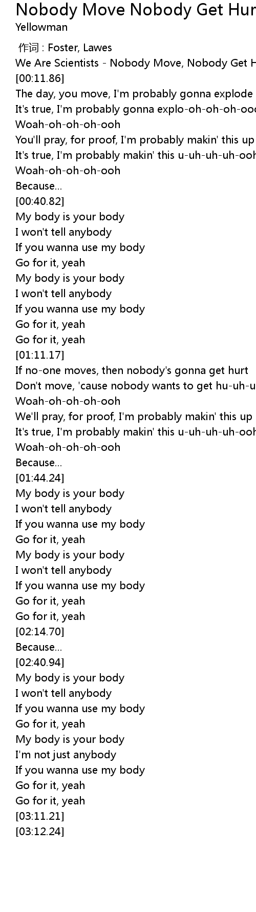 | [00:00.00] | We Are Scientists Nobody Move, Nobody Get Hurt |
