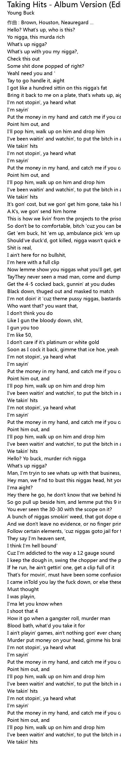 | Hello? Yo buck, murder rich nigga | |