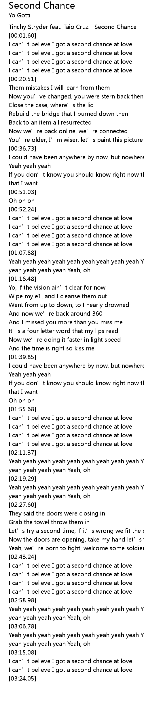 | [00:00.00] | Tinchy Stryder feat. Taio Cruz Second Chance |