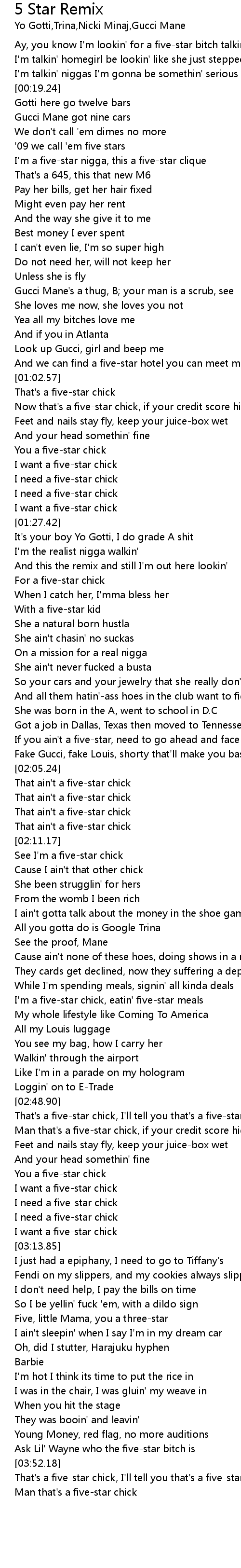 Ay, you know I'm lookin' for a five-star bitch talkin' bout burr |