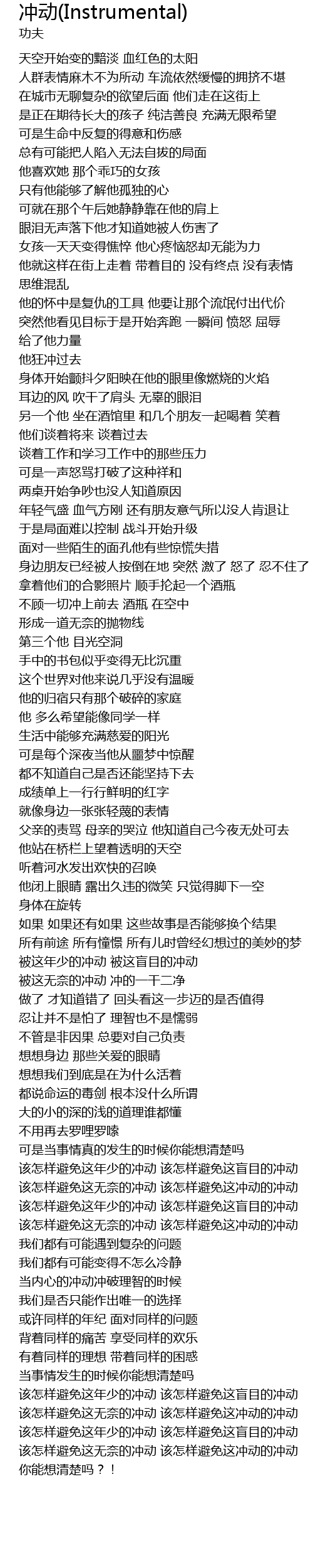 | [04:26.10] | gāi zěn yàng bì miǎn zhè wú nài de chōng dòng gāi zěn yàng bì miǎn zhè chōng dòng de chōng dòng |