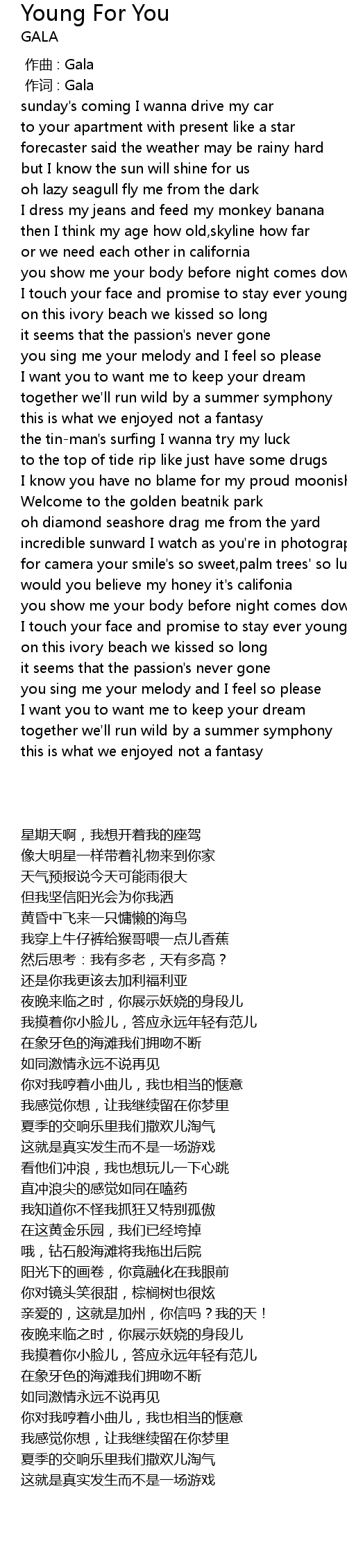 | [02:31.470] | I touch your face and promise to stay ever young |
