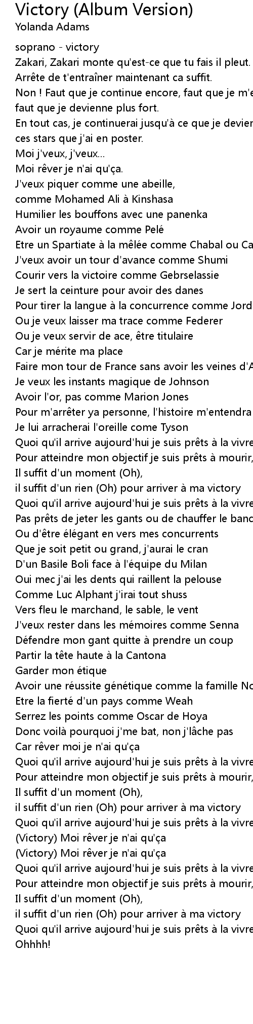 | [02:58.80] | Quoi qu' il arrive aujourd' hui je suis pr ts a la vivre ma victory |