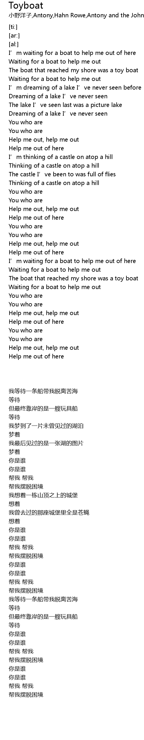 | [00:18.84] | Waiting for a boat to help me out |