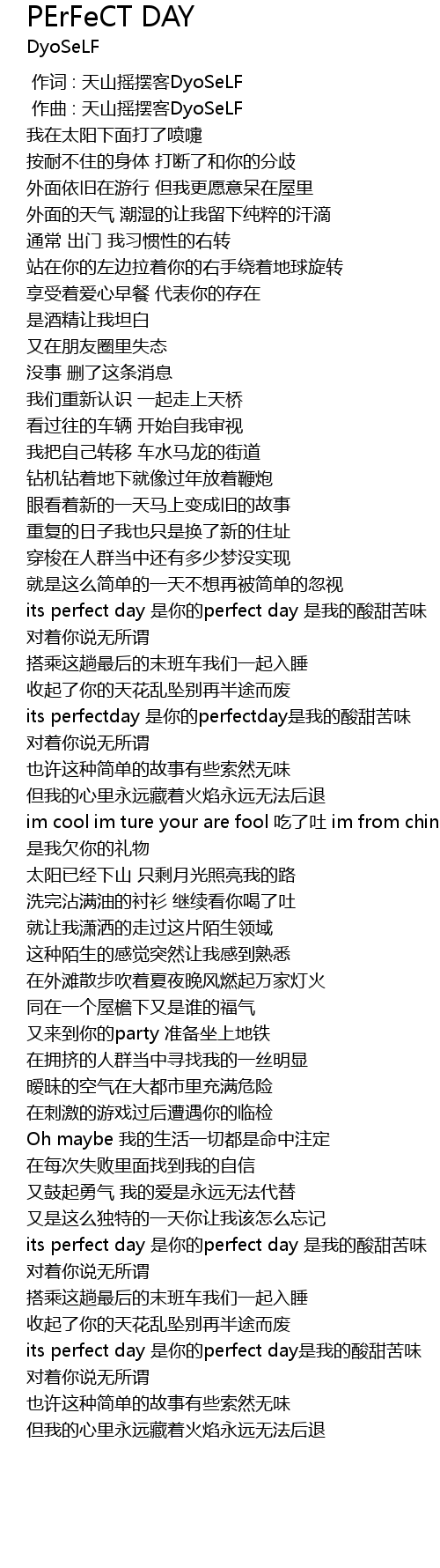 | [02:43.868] | its perfect day shì nǐ de perfect day shì wǒ de suān tián kǔ wèi |