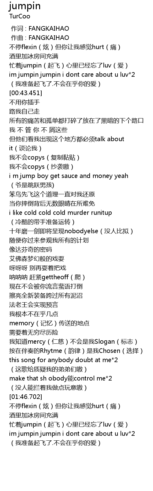 | [01:49.455] | 不停flexin(炫)但你让我感觉hurt(痛) |