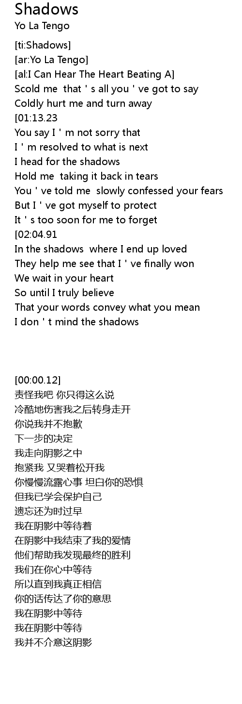 | [01:14.73][02:04.91][02:08.97] | I wait in the shadows |