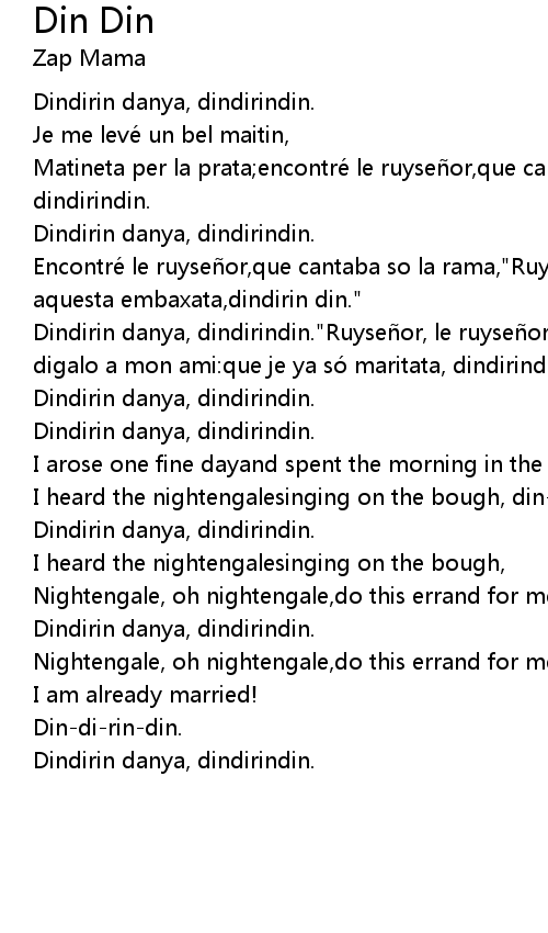 | Dindirin danya, dindirindin."Ruyseñor, le ruyseñor,facteme aquesta embaxata,Y digalo a mon ami:que je ya só maritata, dindirindin." | |