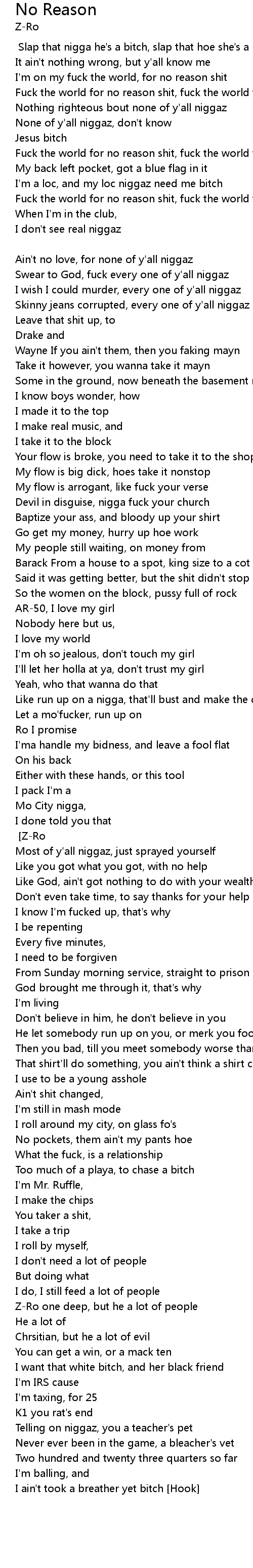 | Fuck the world for no reason shit, fuck the world for no reason bitch | |