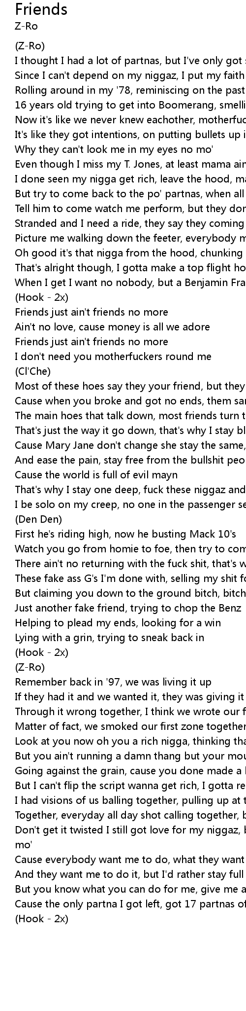 | Most of these hoes say they your friend, but they really ain't down | |