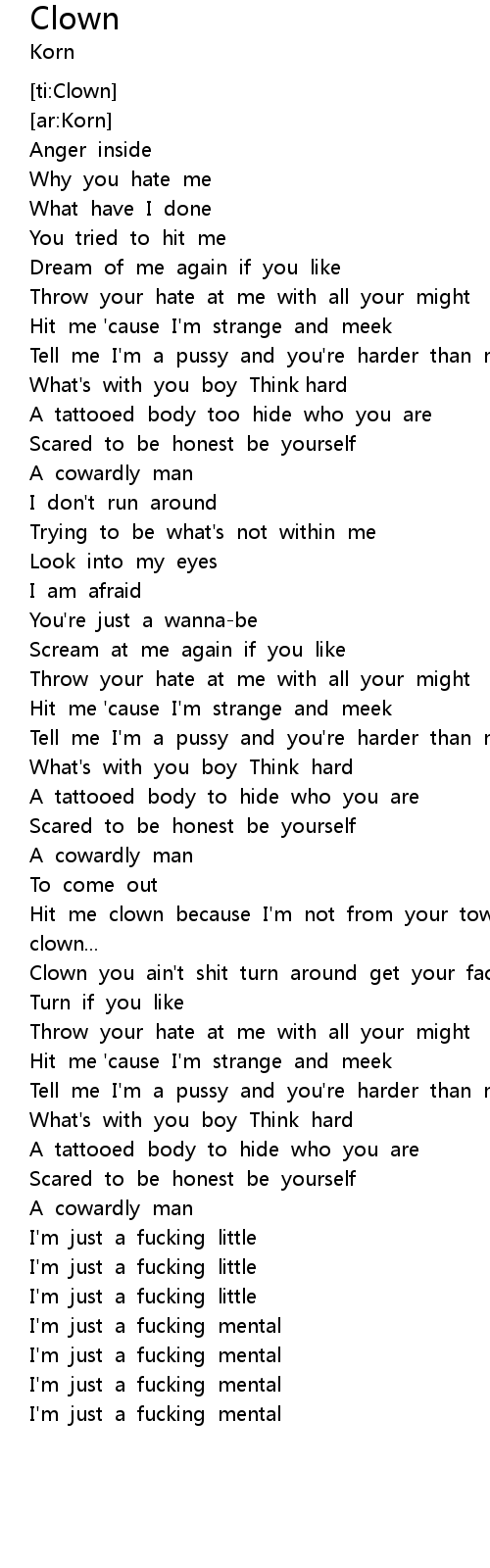 | [03:19.273] | Hit me clown because I'm not from your town now hit me clown... |