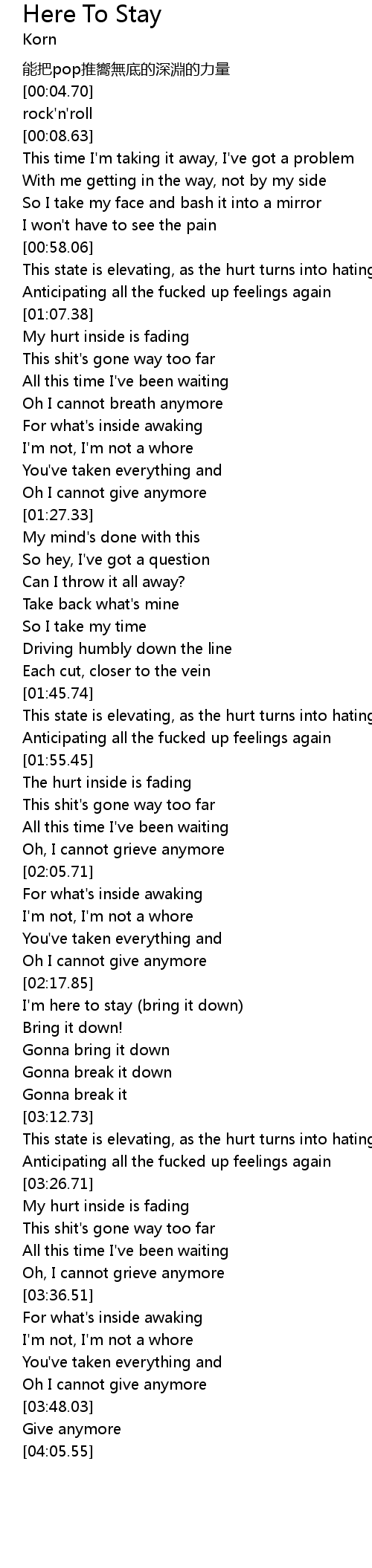 | [02:34.00] | I' m here to stay bring it down |