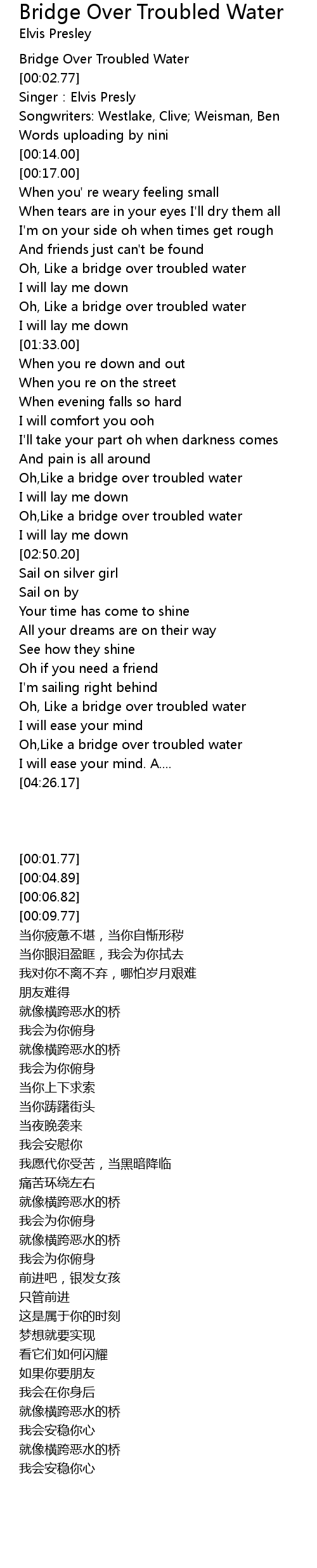 | [03:48.37] | Oh, Like a bridge over troubled water |