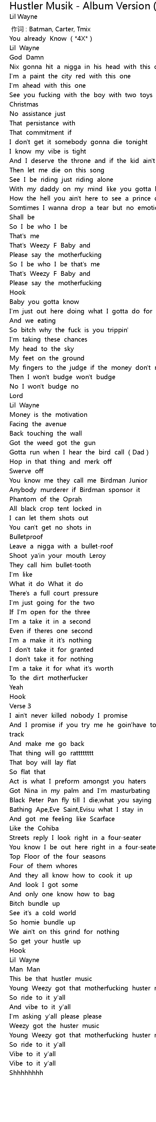 | [04:15.39] | Young Weezy got that motherfucking huster music y'all |