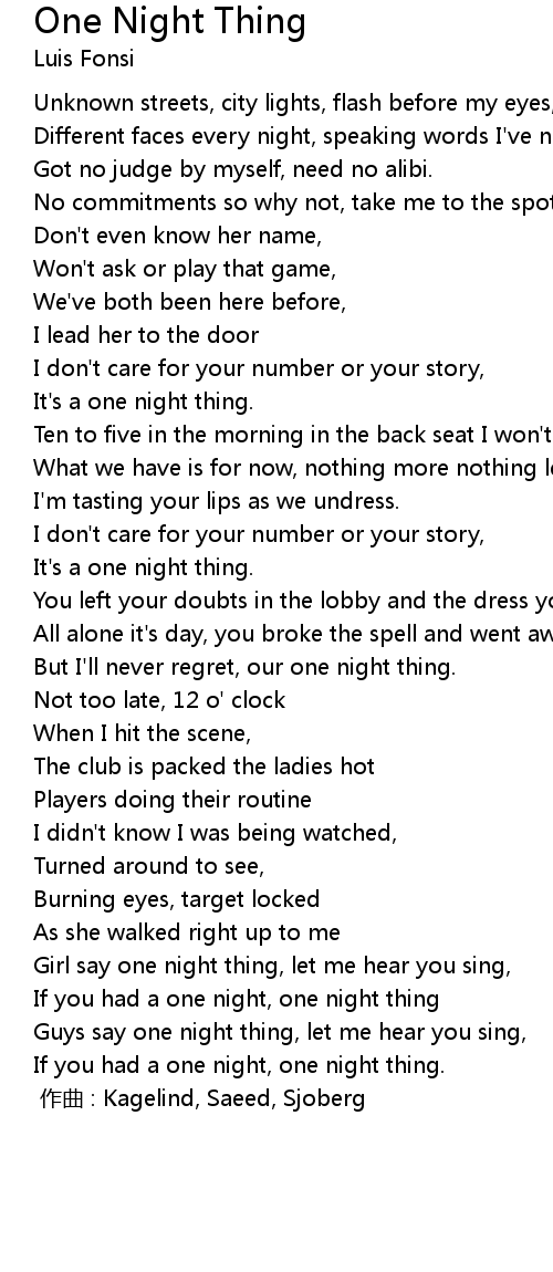 | Girl say one night thing, let me hear you sing, | |