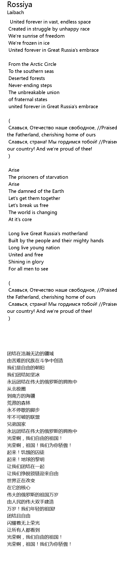 | Славься, страна! Мы гордимся тобой! //Praised be our country! And we're proud of thee! | |