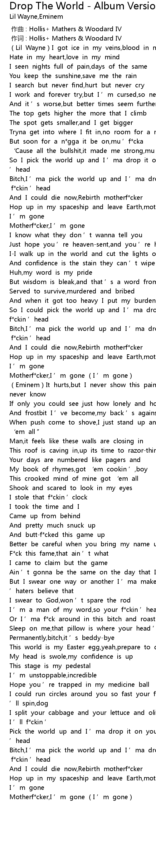 | [00:51.609] | So I pick the world up and I ' ma drop it on your f ckin ' head |