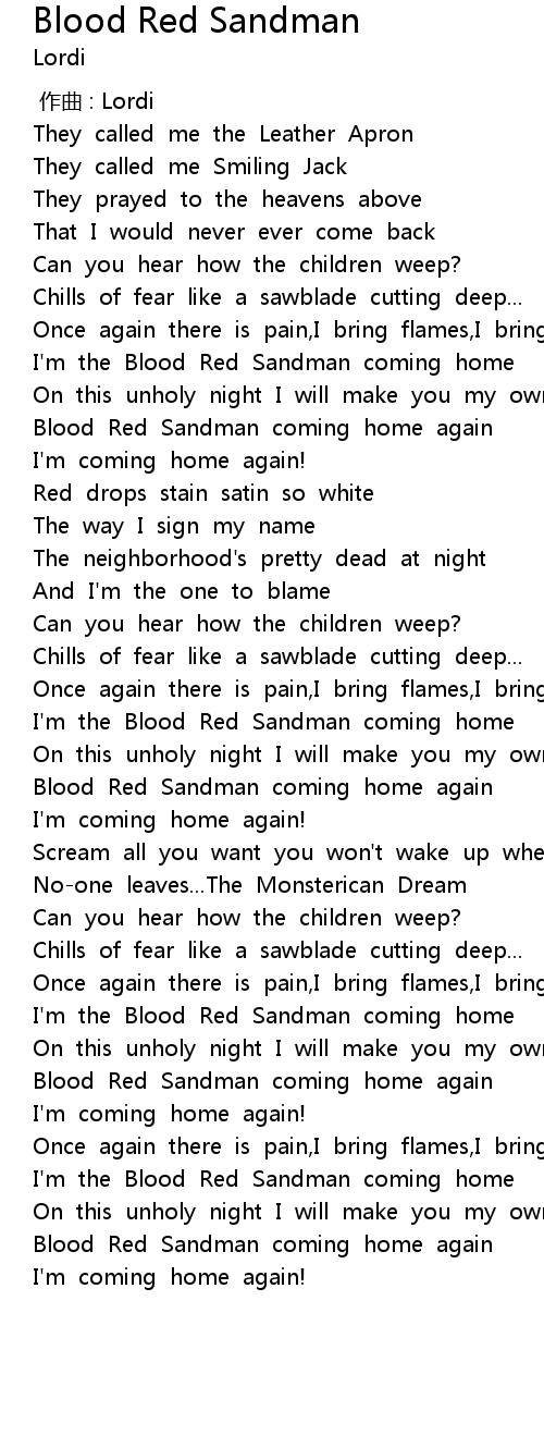 | [02:58.88] | I' m the Blood Red Sandman coming home |